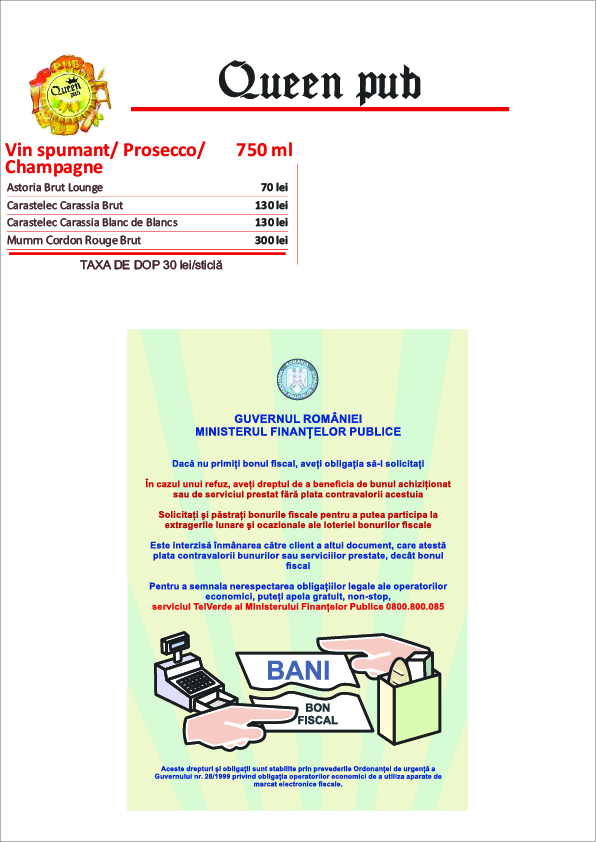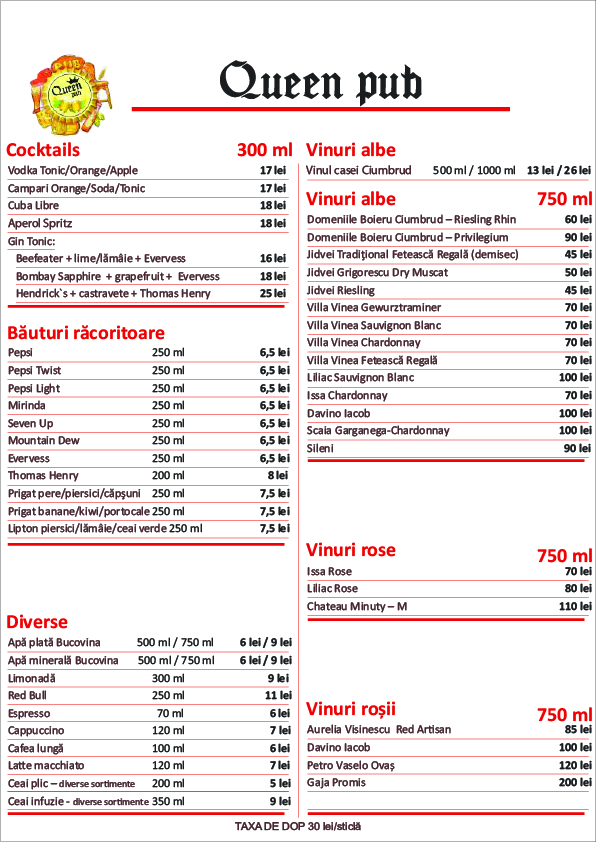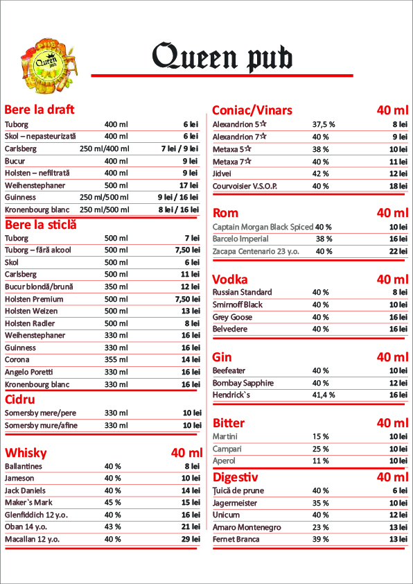 queen pub va asteapta cu o gama diversificata de mancaruri specifice romanesti, atat in restaurant cat si pe terasa
